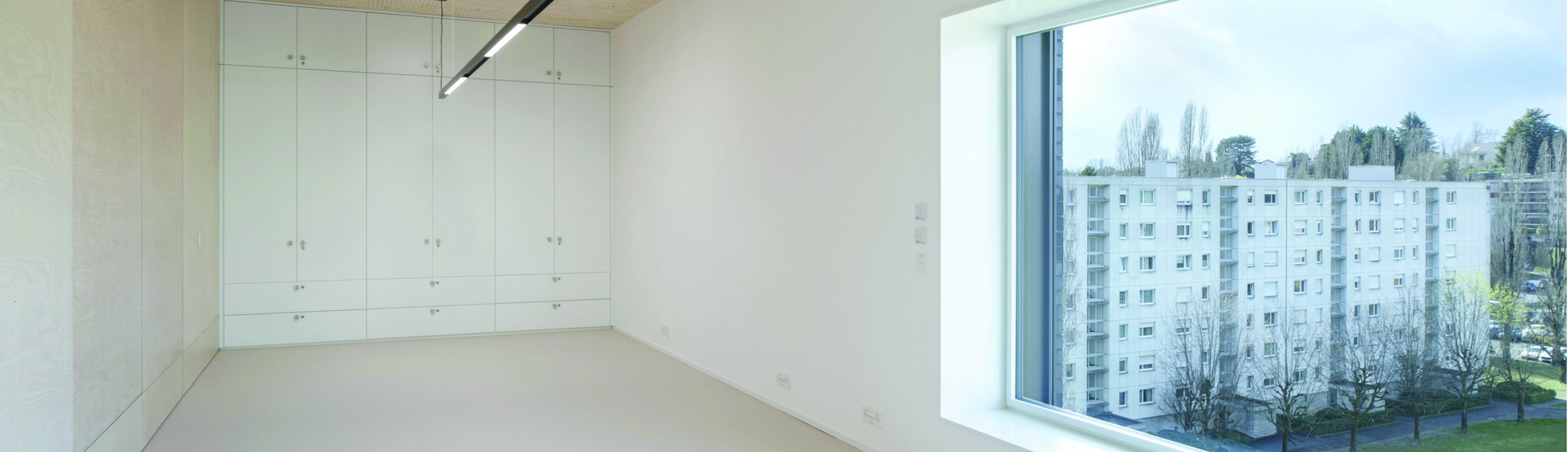 Le parti constructif repose sur une structure préfabriquée en bois, posée sur l’existant sans travaux lourds avec une pose rapide en 3 jours. À l’intérieur, les panneaux de bois apparents constituent à la fois la structure, le revêtement mural et l’expression architecturale des espaces. Cette cohérence matérielle confère aux locaux une atmosphère douce et homogène, entre chaleur du bois clair et lumière naturelle généreuse ouverte sur le paysage d’Ecublens.